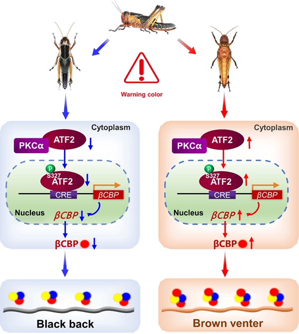 Spatially differential regulation of ATF2 phosphorylation and βCBP expression contribute to warning coloration of gregarious locusts (Image by Xinle KANG and Meiling YANG)
