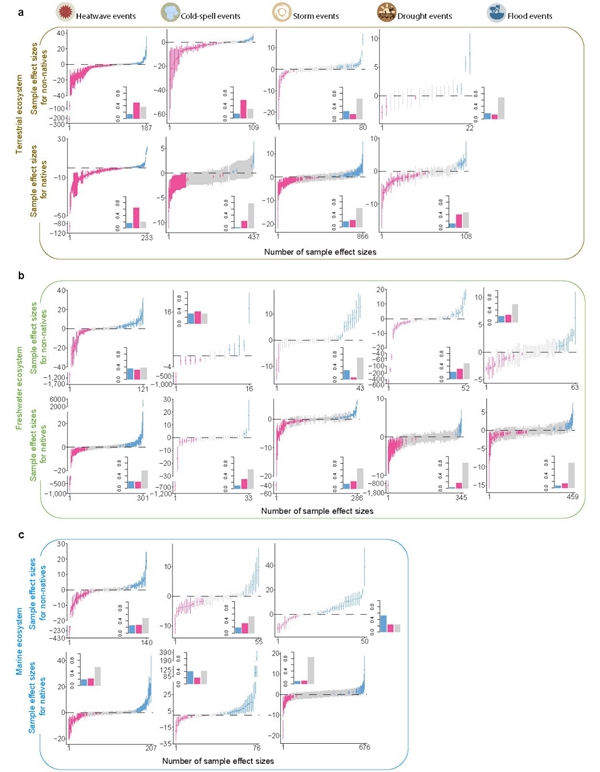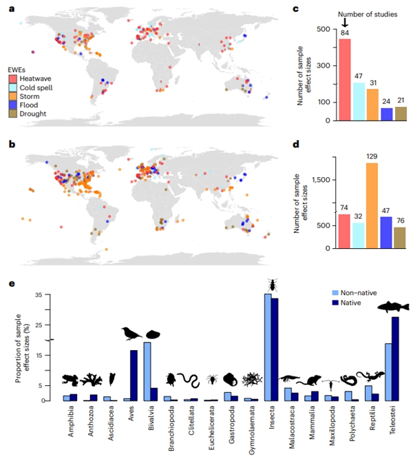 Xuan Liu and colleagues built a database covering 187 non-native and 1,852 native species experiencing different kinds of EWEs including heatwaves, cold spells, storms, floods, and droughts across seventeen classes in terrestrial, freshwater, and marine ecosystems in the past seventy years.