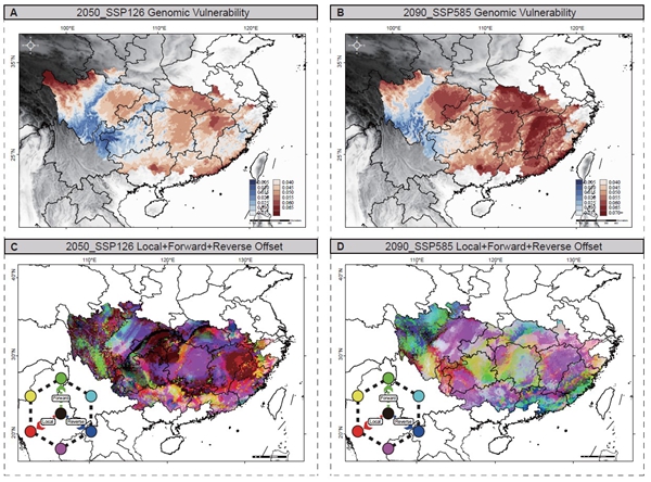 Figure. Predicted genetic offset for future climate change under the SSP 1-2.6 scenario in 2050 and the SSP 5-8.5 scenario in 2090 (image by LI Ming’s Lab)