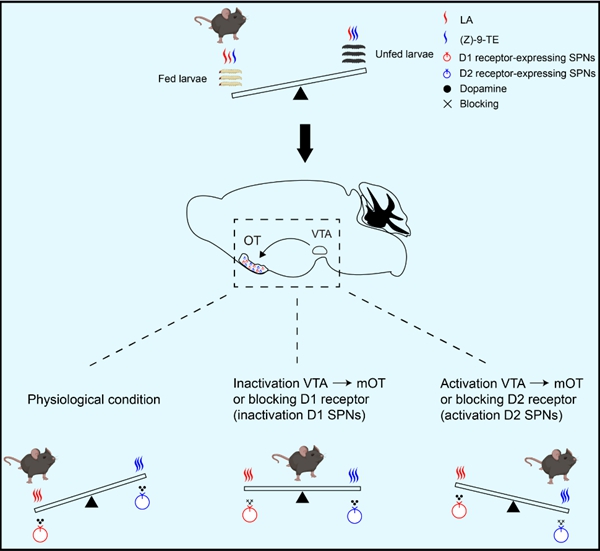 In vivo fiber photometry and pharmacological experiments revealed that D1- and D2-type medium spiny projection neurons in the mOT responded specifically to LA and (Z)-9-TE, respectively. Specifically, D1 receptor signaling mediated attraction toward LA, while D2 receptor signaling was involved in avoidance of (Z)-9-TE. These two signaling pathways form an exquisitely balanced "seesaw"-like working model to orchestrate larvae predation in mice.